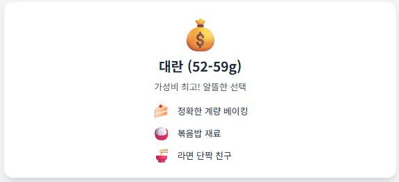 - 대란: 52~59g으로, 특란보다 조금 작지만 가격이 저렴해 훌륭한 가성비를 자랑합니다. 여러 개를 한 번에 사용하거나 베이킹처럼 정확한 계량이 필요한 요리에 편리합니다.