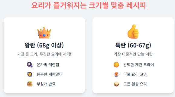 - 특란: 60~67g 사이로 가장 보편적인 크기이며, 어떤 요리에도 잘 어울리는 만능 계란입니다. 스크램블 에그나 계란 프라이, 국물 요리 등 두루 활용도가 높습니다.