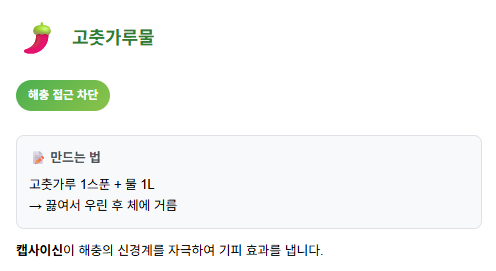 - 캡사이신이 해충의 신경계를 자극해 식물에 대한 흥미를 잃게 만들고, 어떤 해충의 경우 신경 마비까지 유도할 수 있습니다.