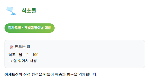 - 식초의 산성 성분이 해충의 피부를 자극해서 접근을 막고, 흰가루병이나 잿빛곰팡이병 같은 식물 질병을 일으키는 균도 억제하는 데 도움이 됩니다.