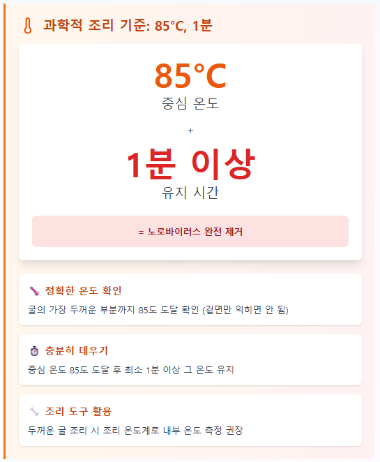 노로바이러스는 끓는 물이나 약한 가열만으로는 완전히 사라지지 않을 수 있습니다. 그래서 식약처에서 권장하는 ‘중심 온도 85도 이상에서 1분 이상’이라는 기준을 꼭 지켜야 진짜 안전하게 먹을 수 있습니다. 이 수치는 노로바이러스의 구조를 무너뜨리고 감염력을 없애는 데 꼭 필요한 최소 열에너지이기도 합니다. 즉, 단순한 감이나 대강의 조리로는 부족하며, 정확한 조리법이 필요하다는 의미입니다.