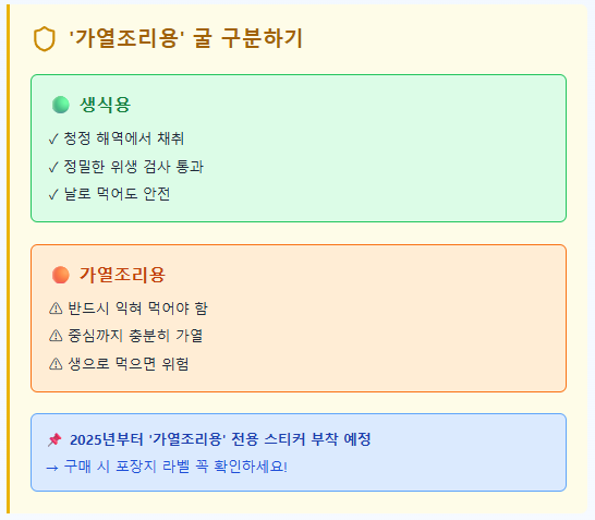 굴 포장지에 '가열조리용'이라고 적힌 문구는, 그 굴은 절대로 생으로 먹어서는 안 된다는 식약처의 공식 경고예요. 포장지에 이렇게 표시하는 이유는, 굴이 잡힌 지역의 바닷물 상태나 유통 과정에서 노로바이러스 등 위험성이 더 높다고 판단됐기 때문입니다.
