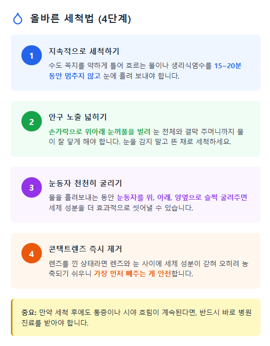 이렇게 철저하게 세척하는 것이 병원에 가기 전 우리가 할 수 있는 가장 확실한 응급처치이자, 시력을 지키는 데 마지막 방어선이 됩니다. 만약 세척 후에도 통증이나 시야 흐림이 계속된다면, 반드시 바로 병원 진료를 받아야 합니다.