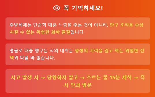 주방세제가 눈에 들어가면 단순히 매운 느낌을 주는 것이 아니라, 안구 조직을 손상시킬 수 있는 위험한 화학 물질임을 꼭 기억해야 합니다. 맹물로 대충 헹구는 식의 대처는 평생의 시력을 걸고 하는 위험한 선택과 다를 바 없습니다.