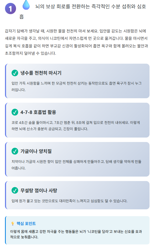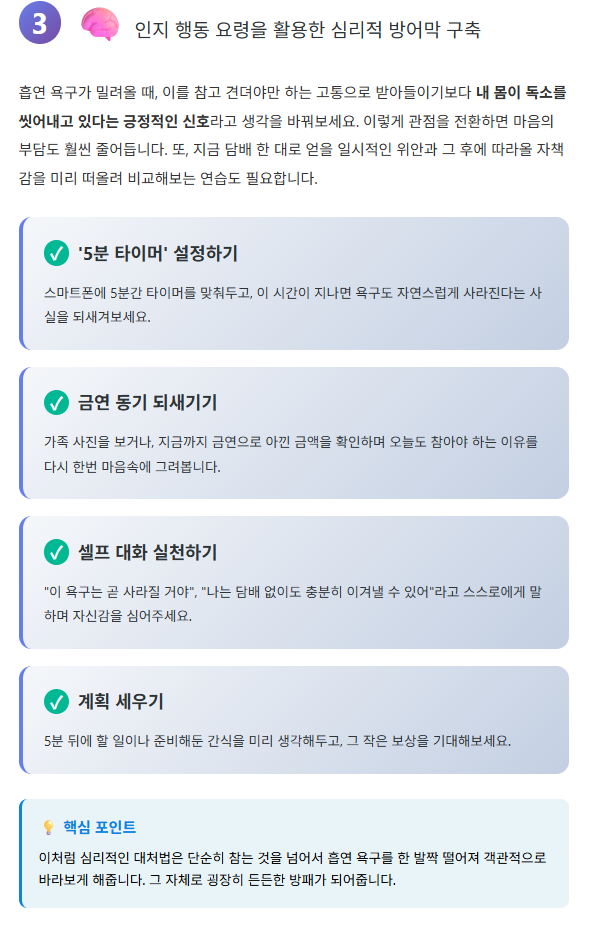 이처럼 심리적인 대처법은 단순히 참는 것을 넘어서 흡연 욕구를 한 발짝 떨어져 객관적으로 바라보게 해줍니다. 그 자체로 굉장히 든든한 방패가 되어줍니다.