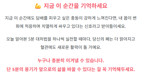지금 이 순간에도 담배를 피우고 싶은 충동이 강하게 느껴진다면, 내 몸이 변화에 적응하며 치열하게 싸우고 있다는 신호라고 받아들이세요.