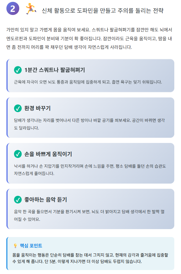 흡연 욕구는 단순히 몸이 니코틴을 원해서 생기기도 하지만, 특정 상황이나 감정에 따라 뇌가 습관적으로 반응하는 데서 비롯되기도 합니다. 그러니 무작정 참으려 애쓰기보다는, 뇌의 관심을 다른 곳으로 돌릴 수 있는 의도적인 행동 전략이 필요합니다.