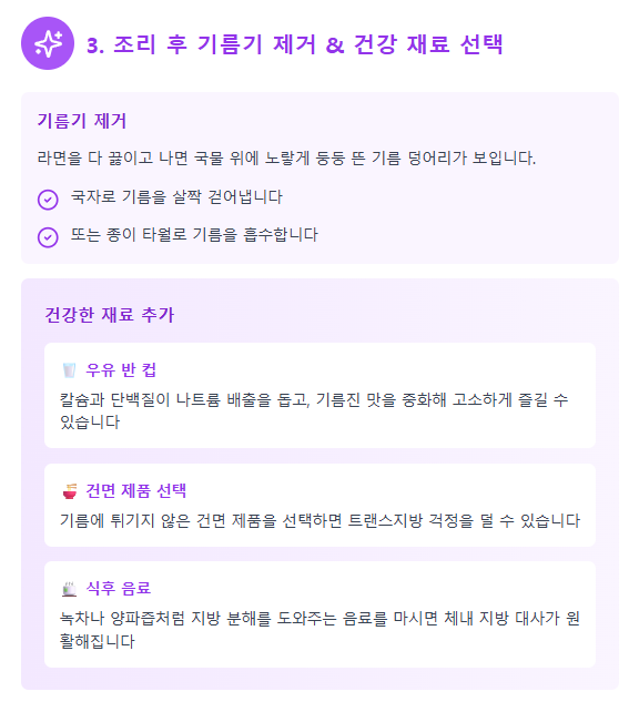 라면을 다 끓이고 나면 국물 위에 노랗게 둥둥 뜬 기름 덩어리가 눈에 띕니다. 이럴 땐 국자로 살짝 걷어내거나, 종이 타월로 기름을 흡수해 보는 게 좋습니다. 이렇게 하면 불필요한 지방 섭취를 바로 줄일 수 있습니다.