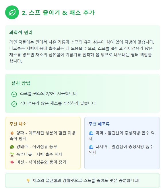 라면 국물에는 면에서 나온 기름과 스프의 유지 성분이 섞여 있어서 지방이 많이 들어 있습니다. 또 나트륨은 지방이 몸에 흡수되는 데 도움을 줍니다. 만약 스프 양을 줄이고 식이섬유가 많은 채소를 넉넉히 넣으면, 채소의 섬유질이 기름기를 흡착해 몸 밖으로 내보내는 데 도움이 됩니다. 이렇게 채소는 마치 일종의 필터처럼 역할을 하게 되는 셈이죠.