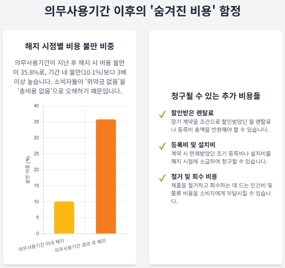 - 이 두 기간을 한꺼번에 헷갈려서, ‘전체 렌탈기간 내내 해지하면 위약금이 나온다’고 오해하는 일이 많습니다. 이런 착각 때문에 예상보다 더 오랜 기간 약정에 묶이는 일이 생깁니다.