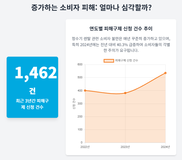 최근 한국소비자원에서 발표한 보도자료(2025년 5월 기준)를 보면, 정수기 렌탈 관련 피해구제 신청이 점점 늘고 있습니다. 전체 피해 사례 중 절반 이상(56.3%)이 계약과 관련된 불만이고, 그중에서도 해지 및 위약금 문제(61.1%)가 주된 이유라고 하네요.