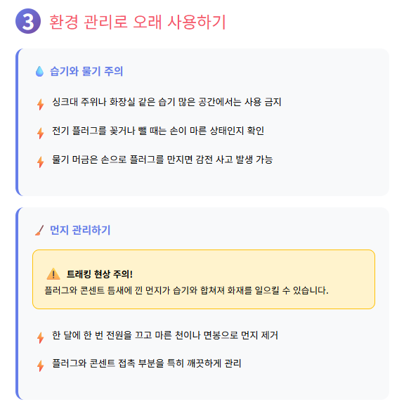멀티탭의 수명과 안전을 지키려면 주변 환경을 잘 살피고 꾸준히 관리하는 게 무엇보다 중요합니다. 습기가 많은 곳에 멀티탭을 두거나, 먼지가 쌓이게 내버려 두거나, 전선에 무리하게 힘을 주면 멀티탭의 성능이 떨어질 수밖에 없죠. 이런 관리 소홀은 누전, 합선 같은 사고로 이어지기도 해 결과적으로 가족의 안전까지 위협할 수 있습니다.