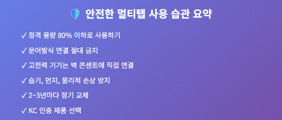 이런 기본 원칙들은 잠깐 귀찮게 느껴질 수 있지만, 사실 내 가족과 내 집을 지키는 가장 쉬운 안전 약속입니다. 작은 습관만 잘 지켜도 멀티탭 화재 걱정에서는 훨씬 자유로워질 수 있습니다.
