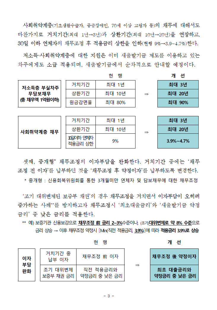 - 부실우려차주에게 적용되는 금리 부담도 크게 낮아졌습니다. 예를 들어 30일 이하 연체자의 경우, 채무조정 후 적용되는 금리 상한이 9%에서 3.9~4.7%로 대폭 낮아져 실제 이자 부담이 확 줄었습니다.
