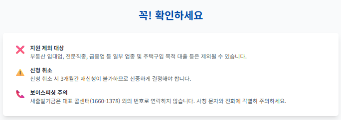 - 보이스피싱에도 주의하셔야 합니다. 새출발기금은 공식 콜센터(1660-1378) 말고는 따로 전화나 문자로 연락을 하지 않습니다. 낯선 연락을 받았다면 꼭 한 번 더 확인해 보세요.
