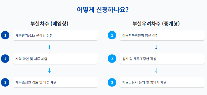 - 신청 방법도 더 쉬워졌습니다. 부실차주는 새출발기금 온라인 플랫폼을 이용하면 되고, 부실우려차주는 신용회복위원회를 통해 신청할 수 있어요.
