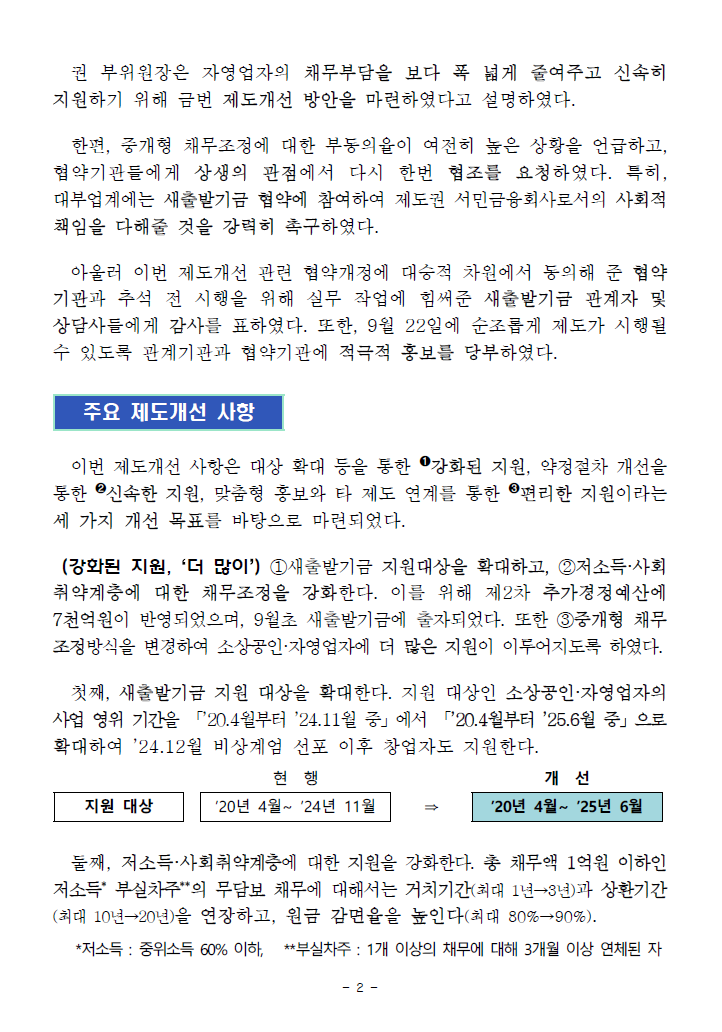 - 또 저소득·사회취약계층ㄴ에 대한 지원도 크게 강화됐습니다. 전체 채무액이 1억 원 이하인 저소득 부실차주라면, 무담보 채무에 한해 원금 감면율이 기존 최대 80%에서 90%까지 올랐고, 상환 기간도 최대 20년까지 늘어났습니다.