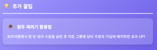 - 특히 원두 찌꺼기는 프라이팬에서 한 번 볶아 수분을 날린 후 사용하면 더욱 효과적입니다.