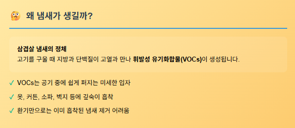 고기를 굽는 과정에서 발생하는 냄새는 단순히 기름이 타는 냄새만이 아닙니다. 삼겹살을 구울 때 지방 성분과 단백질 성분이 고열과 만나 산화 및 열분해되면서 휘발성 유기화합물(VOCs)이 생성되기 때문입니다.