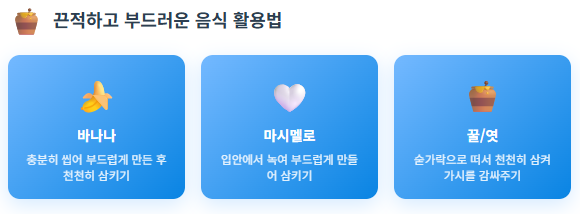위 기본적인 방법으로는 잘 해결되지 않는다면, 식감이 부드럽고 점성이 있는 식품을 이용하는 것도 좋은 선택입니다.