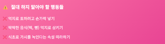 - 손가락을 넣어 억지로 구역질을 유도하다가 오히려 목구멍에 상처가 나거나, 가시가 더 깊이 박힐 수 있어요. 결국 염증이나 출혈로 번질 수 있으니 절대 권하지 않습니다.