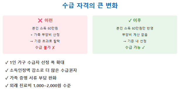 • 가상소득(부양비)이 사라지면서 실제 소득인정액이 낮아져, 더 많은 분들이 1종 또는 2종 수급권자가 될 가능성이 높아졌습니다.