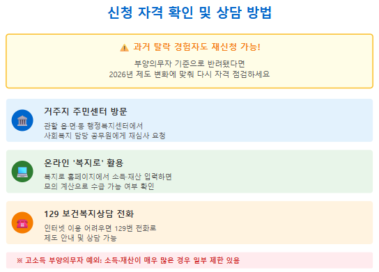 제도가 개선되어도, 본인이 직접 신청하지 않으면 혜택을 받지 못하는 것이 현재 시스템의 특징이니 꼭 관심을 가져야 합니다. 과거에 부양의무자 기준 때문에 신청이 반려됐거나 상담 과정에서 포기한 적이 있다면, 이번 제도 변화에 맞춰 다시 자격을 점검해 보시길 바랍니다.