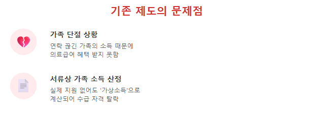 예전에는 본인이 아무리 소득이 적어도, 가족 중 누군가의 소득이 기준을 넘으면 ‘부양비’라는 이름으로 가상 소득이 합산되어 의료급여를 받기 어려웠습니다. 하지만 앞으로는 본인 경제형편만을 따질 수 있게 되어, 실제로 어려운 분들이 가족의 경제력에 관계없이 도움을 받을 수 있습니다.