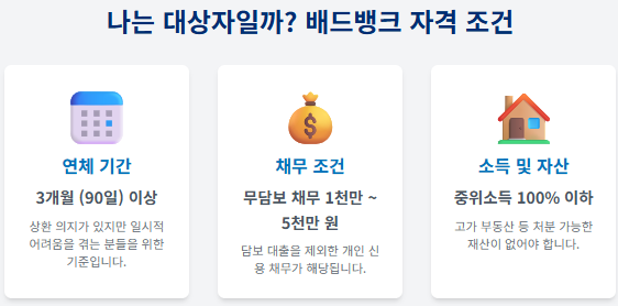 배드뱅크는 아무나 신청할 수 있는 제도가 아닙니다. 일정한 요건을 반드시 충족해야만 지원 대상이 됩니다. 예전에는 ‘신용불량자’라는 다소 포괄적인 표현을 썼지만, 이제는 연체 기간, 채무 상태, 소득이나 자산 등 더 세밀한 기준이 적용됩니다.