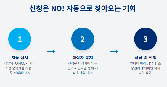 - 정부와 한국자산관리공사가 자격을 갖춘 채무자를 직접 선별해 심사를 진행합니다.