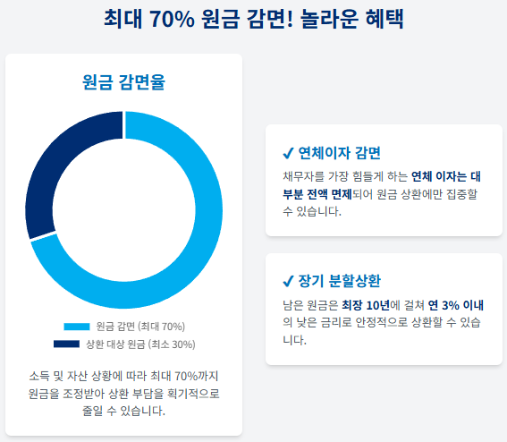 - 채무자가 가진 소득과 자산 상태에 따라 최대 70%까지 원금이 줄어듭니다. 상환 부담을 크게 완화해 주는 효과가 있습니다.