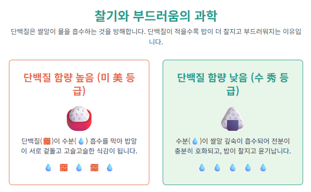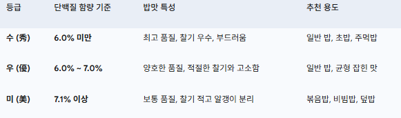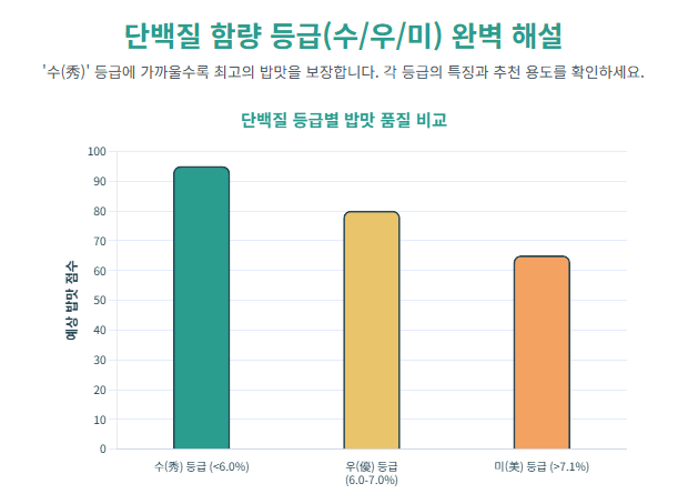 이제 이 단백질 함량이 밥맛을 어떻게 바꾸는지, 그리고 ‘수(秀)’, ‘우(優)’, ‘미(美)’ 등급이 실제로 의미하는 바가 무엇인지 쉽고 정확하게 풀어보겠습니다.