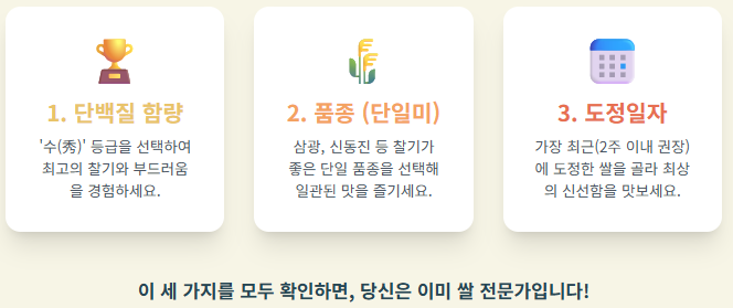 최고의 밥맛을 원한다면 단백질 등급이 ‘수’이며, 도정일자가 최근인 단일 품종 쌀을 고르세요. 이런 정보에 기반한 선택이 가족 식탁을 매일 만족스럽고 든든하게 만들어줄 것입니다.