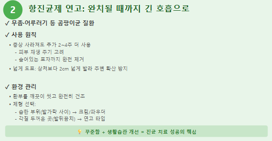진균 치료는 약만으로 끝나는 게 아니라, 꾸준함과 생활습관 개선이 같이 가야 비로소 효과를 볼 수 있습니다.