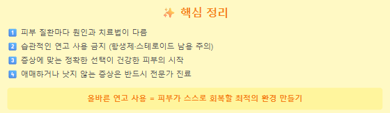 피부 질환마다 원인도, 치료법도 모두 다릅니다. 자극적이라고 무조건 스테로이드를 사용하거나, 상처가 나면 습관적으로 항생제 연고를 쓰는 일은 이제 피해야 할 방식입니다. 우리 손에 쥐어진 작은 연고 한 통에도 과학적인 원리와 사용법이 숨어 있다는 사실을 잊지 말아야 합니다. 증상에 맞는 제대로 된 선택을 할 때, 피부는 비로소 건강을 되찾을 수 있습니다.