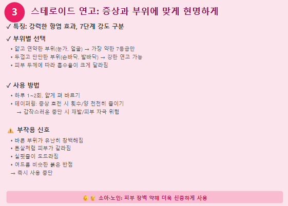 스테로이드 연고는 꼼꼼하게 쓰면 든든한 도움을 주지만, 부주의하게 쓰면 오히려 피부 회복력을 해칠 수 있다는 점, 꼭 기억해 두세요.
