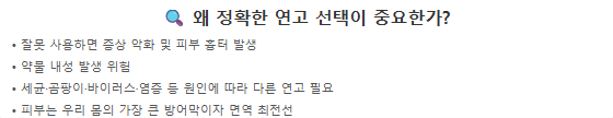 대부분의 피부 연고는 세균, 곰팡이, 바이러스, 염증 반응 등 뚜렷한 목표에 맞게 개발되었습니다. 이런 원인 구분 없이 ‘일단 아무거나 바르자’는 식의 습관은 약물 내성을 키우고, 치료도 늦어질 위험이 있습니다.