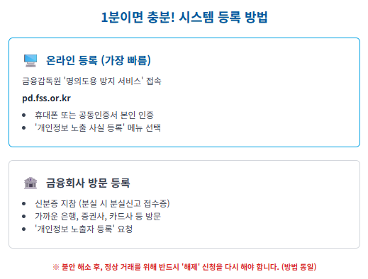‘개인정보노출자 사고예방시스템’에 등록하는 과정은 매우 간단합니다. 특히 긴급한 상황에도 온라인으로 금융감독원의 명의도용 방지 서비스를 이용하면 비대면으로 신속하게 처리할 수 있어, 시간 낭비를 막아줍니다. 등록을 원하는 경우에는 온라인 포털을 이용하거나 신분증을 들고 가까운 금융회사 영업점을 직접 방문할 수 있습니다. 특히 급박한 상황에는 온라인 등록이 가장 빠른 선택입니다.