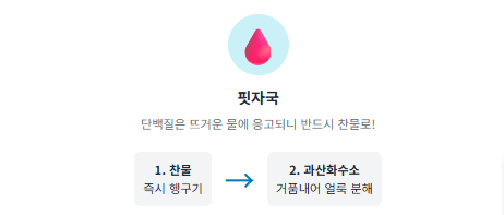 - 피는 따뜻한 물에 닿으면 단백질이 응고되어 제거가 더 어려워집니다. 반드시 찬물로 충분히 헹군 뒤, 과산화수소를 얼룩에 소량 발라 살살 문질러 보세요.