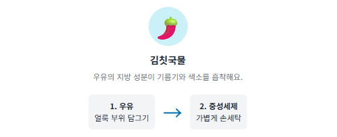 - 옷에 김치국물이 묻었다면 우유에 푹 담가 두세요. 우유에 들어 있는 지방 성분이 김치의 기름을 분해하고, 단백질이 색소까지 흡착해줘서 얼룩이 한결 옅어집니다.