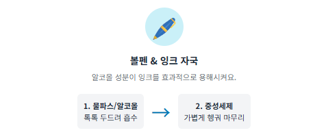 - 볼펜 잉크는 물파스의 휘발성 성분이 있어 쉽게 녹아 나갑니다. 얼룩 부위에 물파스를 살짝 두드려주면 잉크가 옷감 밖으로 빠져나와 얼룩이 퍼지지 않고, 말끔하게 제거할 수 있습니다.