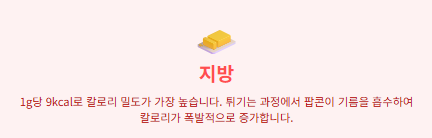 - 팝콘을 튀기는 데 쓰이는 오일이나 버터가 전체 칼로리에서 가장 큰 부분을 차지합니다. 지방 1g에는 약 9kcal가 들어 있으니, 탄수화물이나 단백질보다 훨씬 높은 에너지입니다. 팝콘 옥수수는 튀겨지면서 다공성 구조로 바뀌죠. 덕분에 기름을 스펀지처럼 쏙쏙 빨아들입니다.
