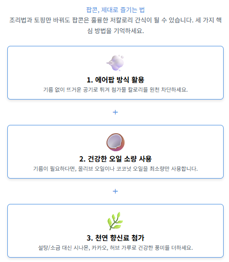 이제 팝콘이 왜 고칼로리 음식으로 여겨지는지 알게 됐으니, 이번엔 죄책감 없이 팝콘을 즐길 수 있는 현실적인 방법을 소개해 드릴게요. 조리법이나 토핑만 조금 바꿔도 팝콘은 훌륭한 저칼로리 간식으로 변신할 수 있습니다.