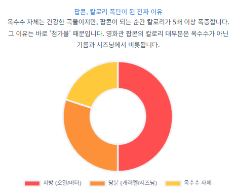 팝콘의 칼로리를 급격히 올리는 첨가물은 크게 세 가지로 나눌 수 있습니다. 각 첨가물이 우리 몸에 어떤 영향을 주는지, 조금 더 정리해볼게요.