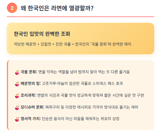 • 라면 국물은 단순히 면을 익히는 역할을 넘어 밥을 말아 먹는 또 다른 즐거움까지 더해줍니다. 한국인 특유의 ‘국물 문화’와 잘 어울릴 수밖에 없습니다.