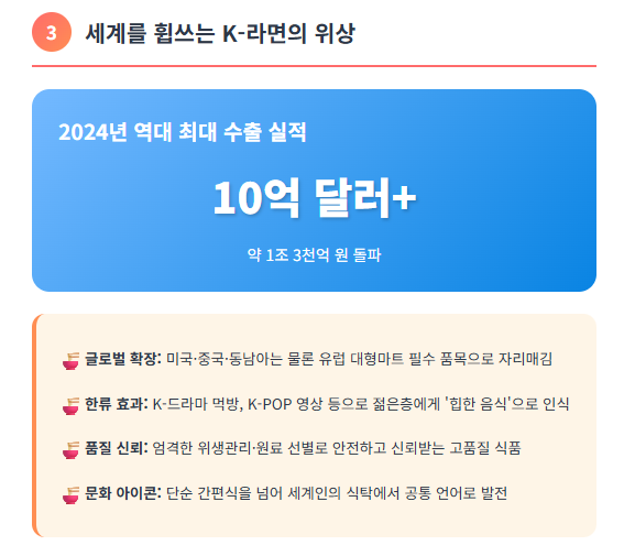 • 품질면에서도 한국 라면은 엄격한 위생 관리와 철저한 원료 선별 과정을 거쳐 생산되어, 전 세계 소비자들에게 안전하고 신뢰할 수 있는 고품질 식품으로 인정받고 있습니다.