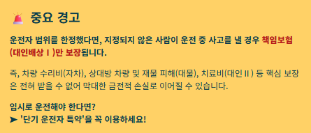 가족 차량 보험을 고민한다면, 예를 들어 부모님 차량을 주말에만 이용하는 20대라면 평소엔 부모님 이름으로 연령 한정 특약을 유지하고, 본인이 차량을 이용할 때만 단기 운전자 특약 (임시 운전자 특약)을 가입하는 것이 효과적이고 현실적인 방법입니다.