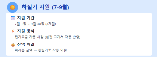 이처럼 자동 차감 방식은 복잡한 절차 없이 곧바로 전기요금 부담을 덜어주기 때문에, 여름철 냉방 복지의 실효성을 높이는 데 큰 도움이 됩니다.