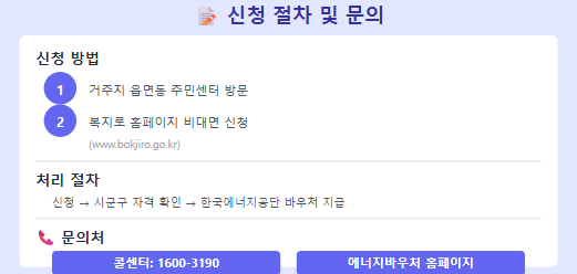• 신청은 거주지 읍면동 주민센터에 방문하거나 복지로 홈페이지에서 비대면으로 할 수 있습니다. 이후 시군구 행정기관에서 자격을 확인하고, 최종적으로 한국에너지공단에서 바우처를 지급하게 됩니다.