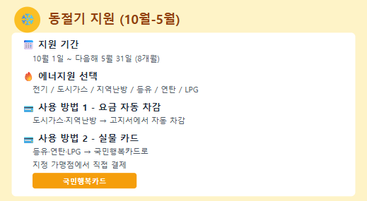 • 등유, 연탄, LPG 등 별도로 구입이 필요한 경우에는 국민행복카드 형태의 전용 카드를 받아 지정 가맹점에서 직접 결제할 수 있습니다.